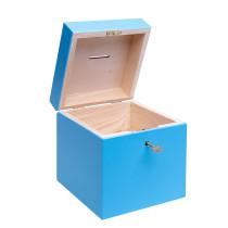 Drewniana skarbonka w kolorze niebieskim z kluczykiem" to urocza i praktyczna skarbonka wykonana z drewna, która jest pokryta niebieską farbą. Posiada klucz, którym można zabezpieczyć zawartość przed nieautoryzowanym dostępem. Jest to doskonały sposób na oszczędzanie pieniędzy lub przechowywanie innych cennych przedmiotów. Skarbonka ta łączy w sobie funkcjonalność i estetykę, dzięki czemu stanowi zarówno praktyczny pojemnik, jak i uroczy element dekoracyjny w pokoju lub biurze.